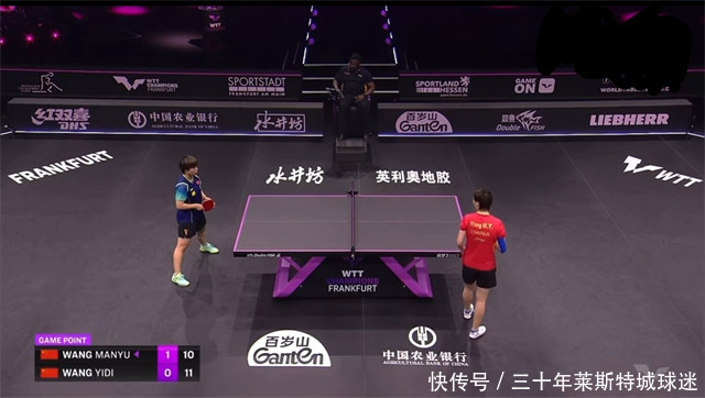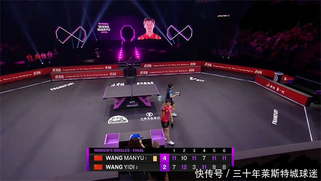 WTT法兰克福冠军赛,女单决赛,国乒提前包揽冠亚军,王曼昱4-2打败王艺迪,六局比分为11-7、10-12、11-3、7-11、11-8、11-8。