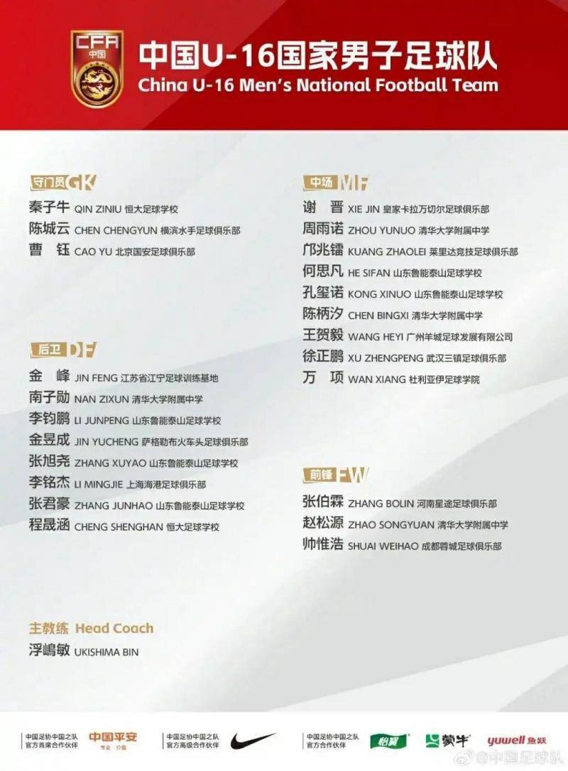 跟着比赛附进,U16国足也从插足本期集训的30名球员中彩选出23东谈主的比赛声势,包括邝兆镭、万项在内的中枢球员系数入列。而动作新东谈主,效劳于日本横滨水手俱乐部U18队的门将陈城云也得以入选。
